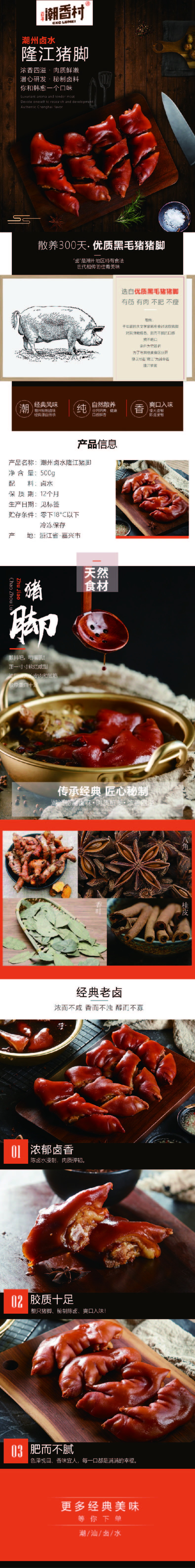 產(chǎn)品介紹:潮州鹵水 隆江豬腳——韓愈的最愛!相傳,千年前的大文學(xué)家韓愈食過這款豬腳,對其彈嫩糯香、肥而不膩的口感贊不絕口,親自為它題名,為了與其他美食區(qū)分開,便以地名“隆江”為其命名--隆江豬腳。從此,隆江豬腳名揚(yáng)四海,備受廣東人民歡迎,當(dāng)?shù)亓鱾髦@樣一句話:“吃隆江豬腳要用鐵絲箍住舌頭,不然會把舌頭和豬腳一起吞下。” 工藝:陳鹵鹵制 規(guī)格(g):500g 包裝規(guī)格:500g/袋 箱規(guī):無