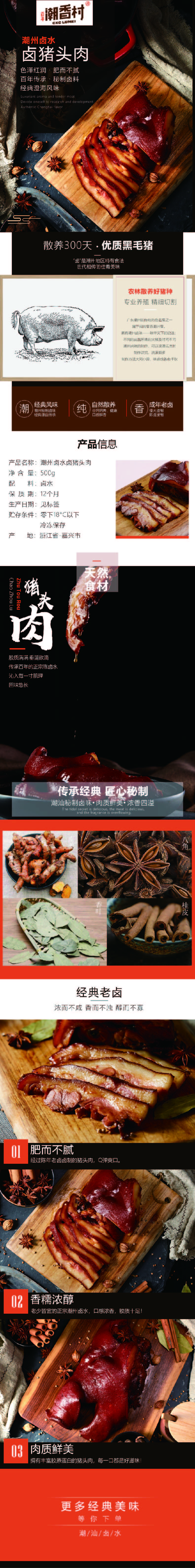 產(chǎn)品介紹:潮州鹵豬頭肉——經(jīng)過陳年老鹵鹵制的豬頭肉,Q彈爽口,膠質(zhì)滿滿,垂涎欲滴,傳承百年的正宗陳鹵水沁入每一寸肌理,回味悠長。